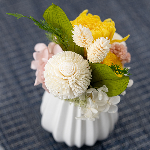 Prière(プリエール)とは、フランス語で「祈り」の意。いつも笑顔で明るく華やかなお人柄だった故人を偲び、表現したプリザーブドフラワー仏花です。いつまでも美しい花と共に想いをこめて。
